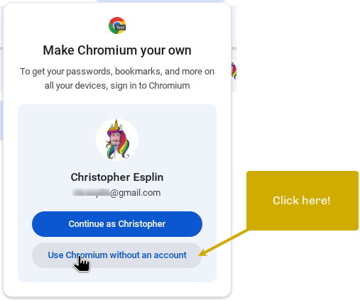 Chromium will tempt you to use Chrome with your account. DO NOT FALL FOR IT. Your Chrome account will fuss with the settings and likely break the app. If you do mess up your Chromium profile, you can reset it. The commands from the main menu are "c" then "4".